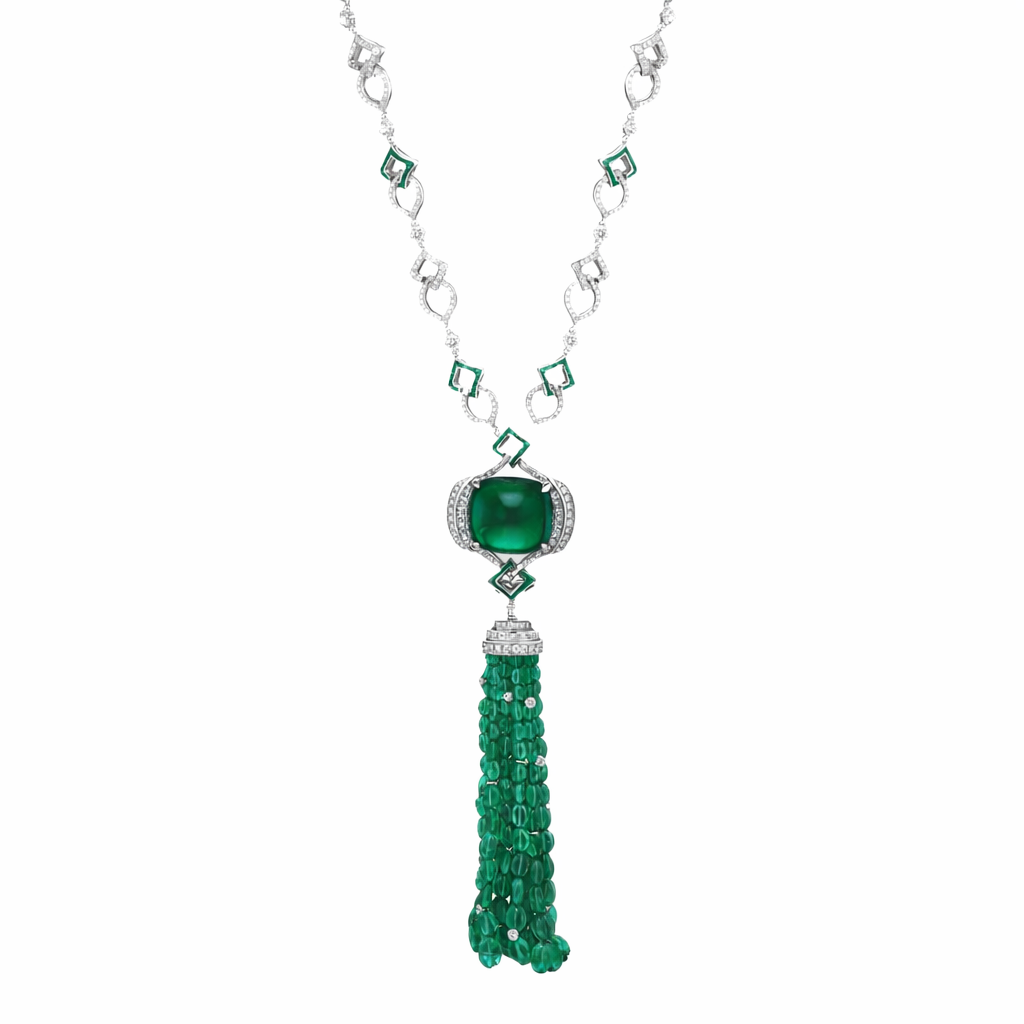 Below the emerald, a cascading broom of smaller emeralds gracefully hangs, creating a fluid and enchanting movement. The pendant is designed to drape elegantly to the chest, creating a stunning silhouette that exudes elegance and grandeur.