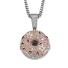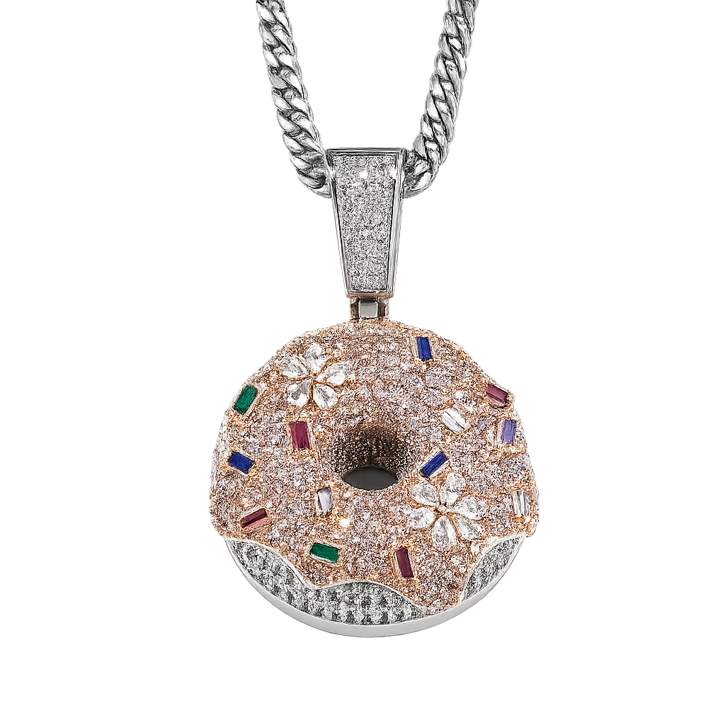 Sweet, bold, and iced-out to perfection. The Diamond Glaze Donut Pendant features a glossy donut silhouette fully pavé-set with shimmering simulated diamonds, accented with rainbow baguette gems and flower-like clusters for a playful luxury finish. Designed to catch light from every angle, it’s the perfect statement piece for everyday drip or special nights out.