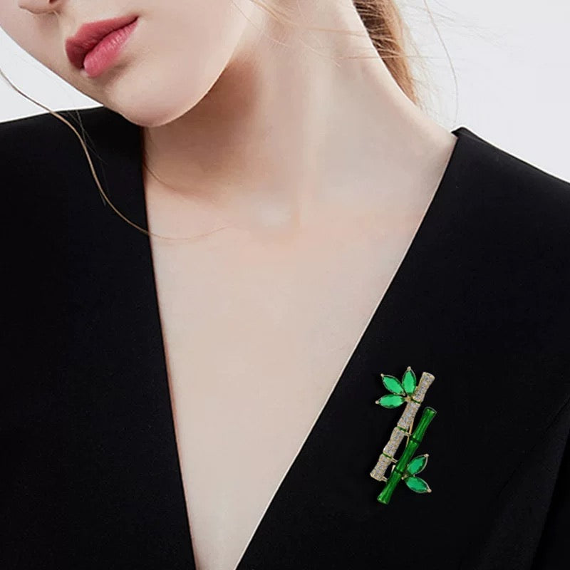 The Verdant Twin Bamboo Brooch draws inspiration from the quiet strength of bamboo — a symbol of resilience, growth, and unwavering grace. Two sculpted simulated emerald stalks cross in harmonious symmetry, representing balance and enduring partnership.