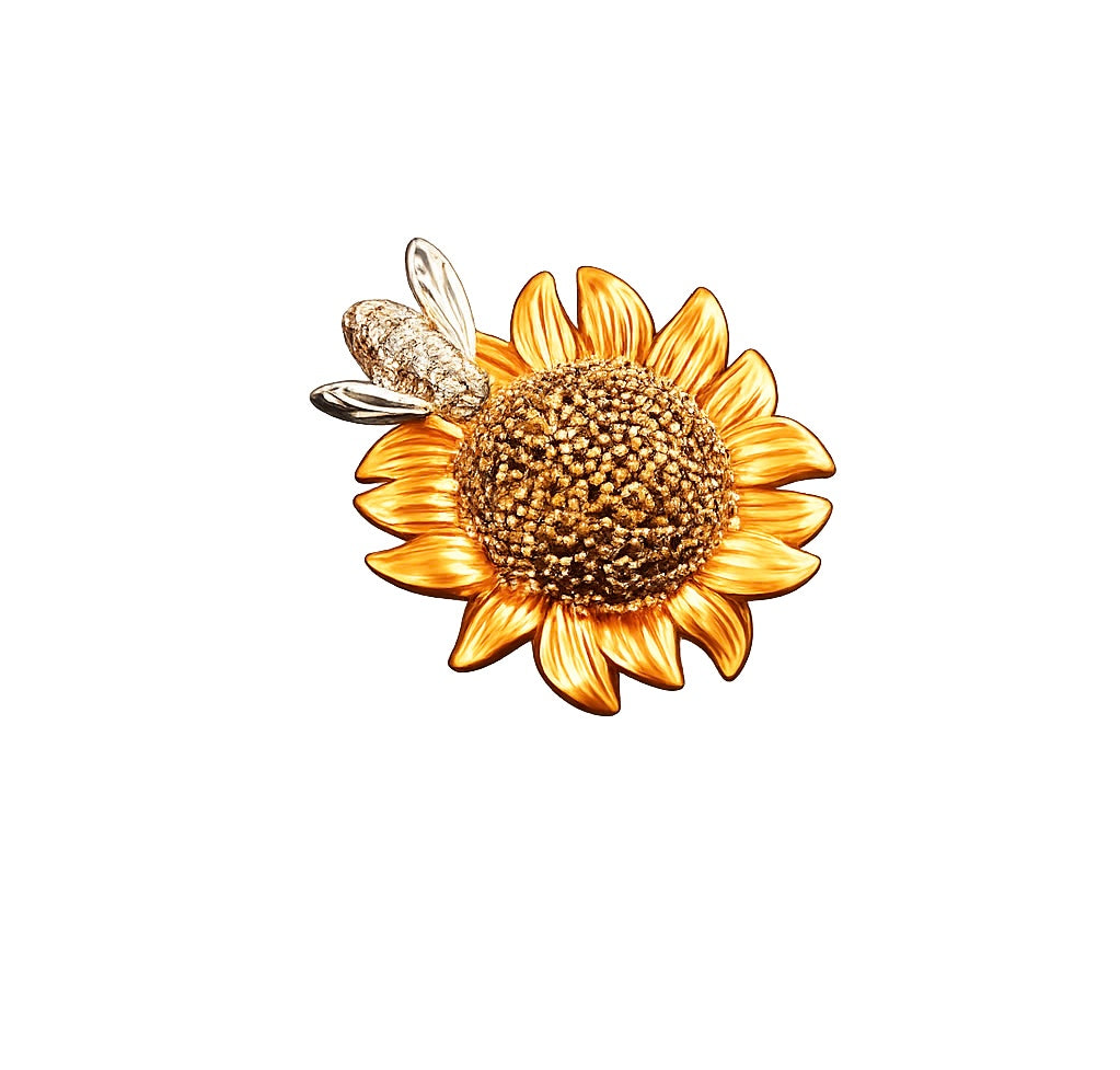 The Honeyed Majesty Brooch captures the warmth of golden sunlight in full bloom. Sculpted in rich gold tones, each petal fans outward in a graceful display of strength and elegance, while the textured center glistens with intricate detailing — echoing the natural beauty of a sunflower at its peak.
