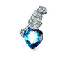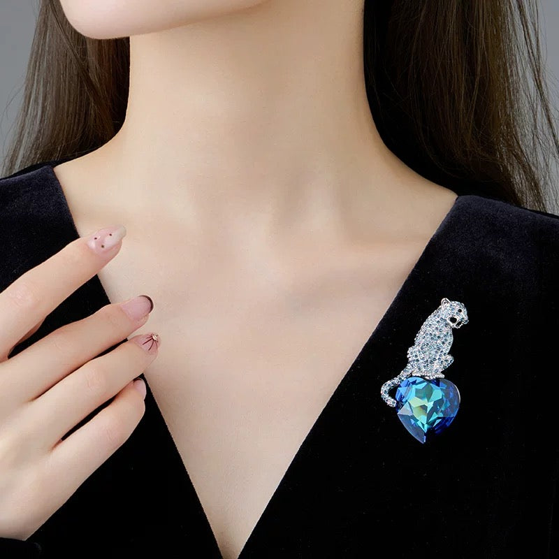 A simulated diamond-pavé panther, sculpted in luminous white gold vermeil, perches with quiet dominance atop a mesmerizing heart-cut blue simulated diamond. Each carefully set stone creates a fluid shimmer across the panther’s body, echoing the strength and grace of the wild. Its deep, midnight gaze evokes mystery and control, while the faceted blue heart beneath reflects light like a captured ocean at dusk.