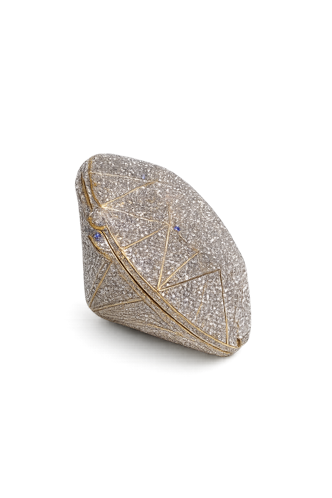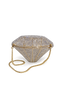 The Crown Jewel Minaudière is a sculptural masterpiece inspired by the brilliance of a perfectly cut diamond. Designed with a dramatic faceted silhouette, this statement clutch is fully encrusted in shimmering crystals that catch the light from every angle, creating a radiant glow with every movement.