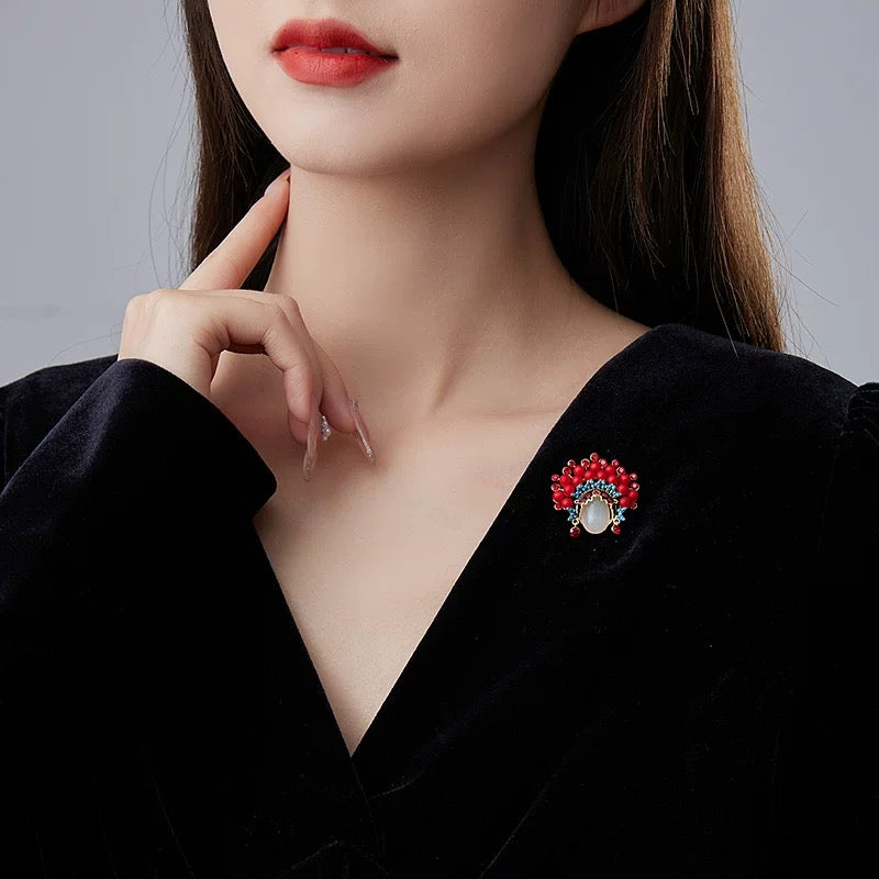The Empress Opera Brooch draws inspiration from the grandeur of imperial opera crowns, reimagined in radiant, contemporary form. A luminous milky cabochon centerpiece anchors the design, framed by intricate detailing that evokes ceremonial elegance.