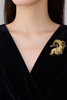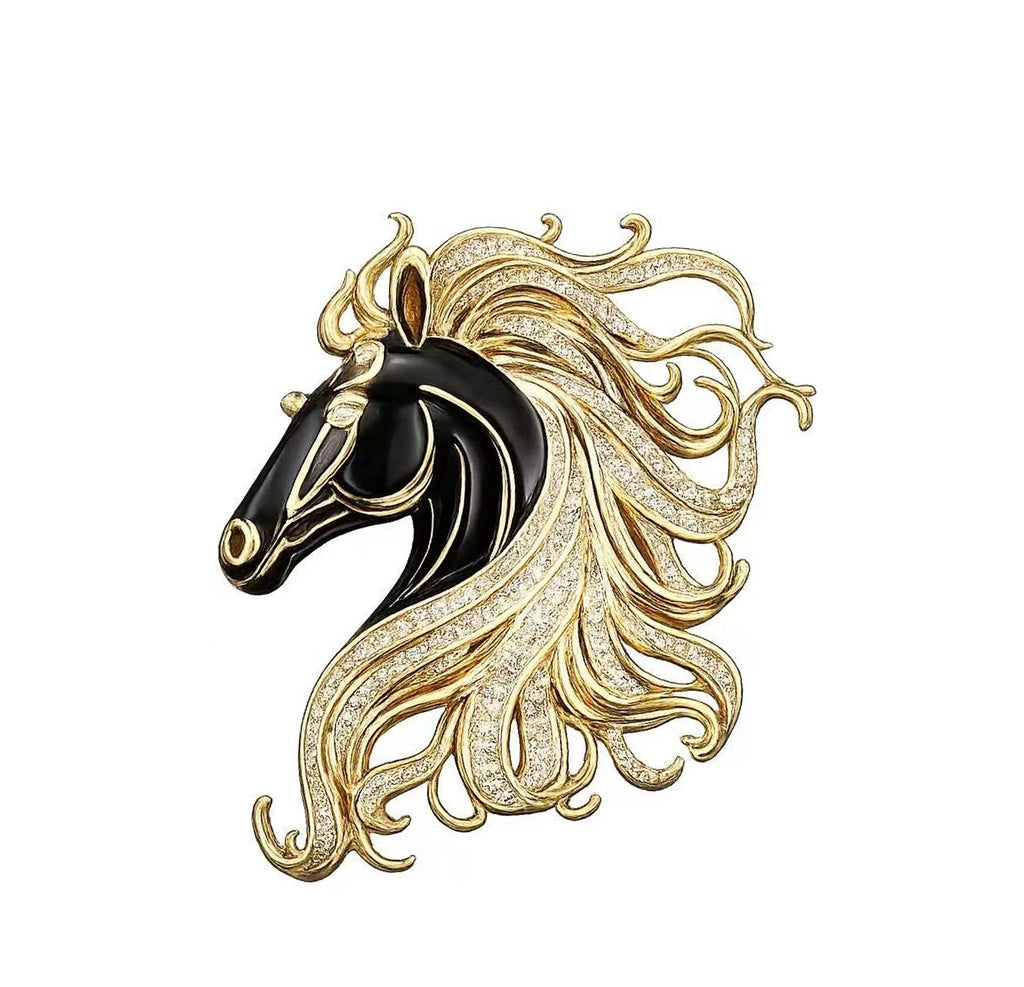 The Golden Tempest Brooch embodies strength in motion, inspired by the untamed beauty of a galloping stallion. Sculpted with a striking black enamel profile, the design is framed by a sweeping mane of radiant gold, flowing in dramatic curves and adorned with meticulously set brilliant simulated diamonds.