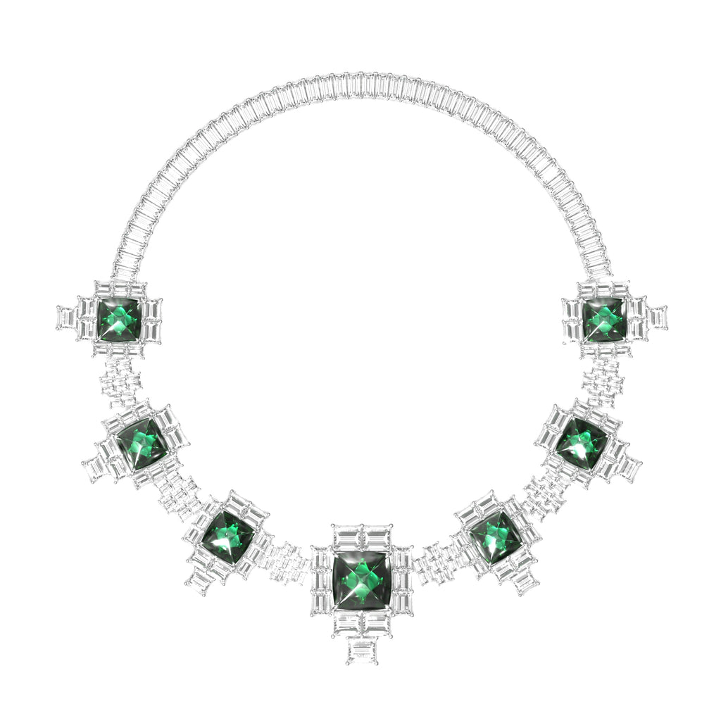 Surrounding these magnificent emeralds, a regal procession of emerald-cut simulated diamonds, totaling 32 carats, forms a dazzling cascade of light. Each simulated diamond, with its perfect symmetry and precise cut, adds a captivating luminosity that further enhances the necklace's allure.