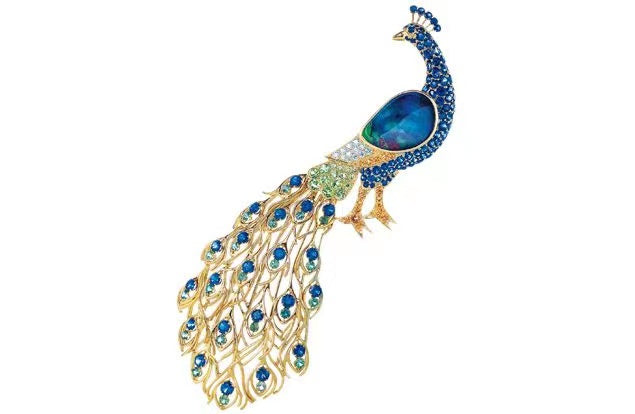 This peacock brooch is hand crafted with simulated black opals, green tourmalines, sapphires and diamonds set in yellow gold vermeil - a tour de force of our craftsmanship that perfectly captures the sculptural allure of the vintage bird.