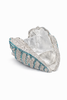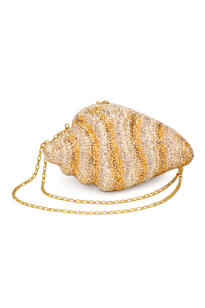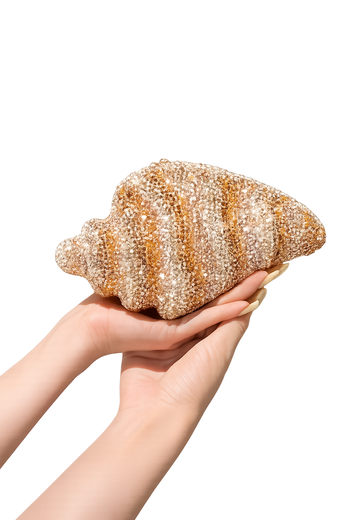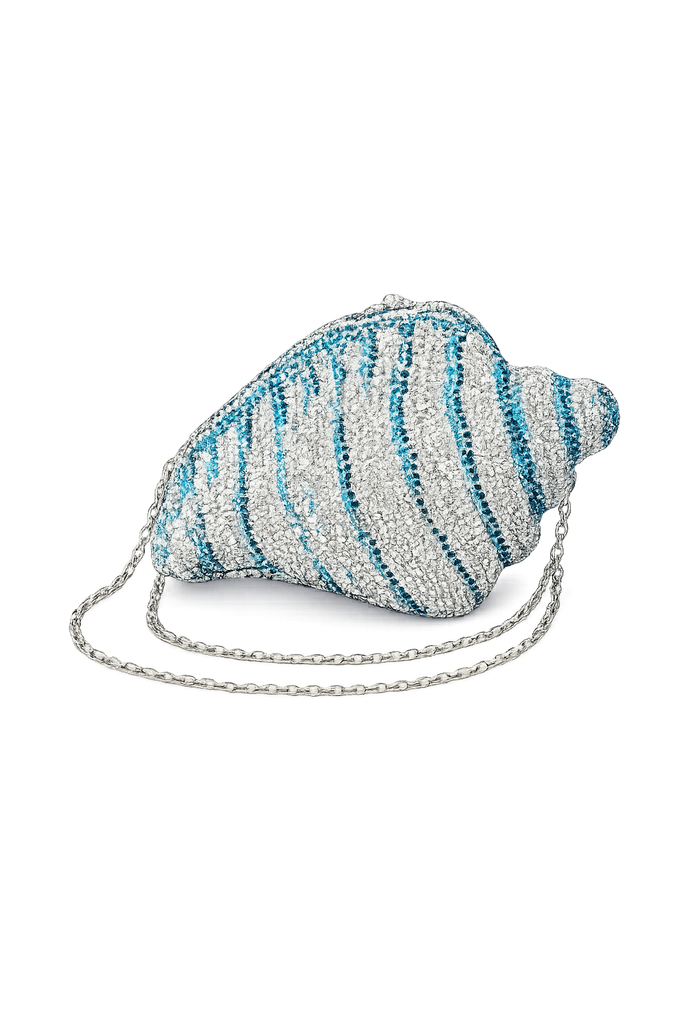 Inspired by the natural curves of a conch shell, the Concha Minaudière is a sculptural evening clutch designed as a statement of refined glamour. Fully encrusted with precision-set crystals, its flowing, ridged silhouette captures light from every angle, creating a soft, luminous shimmer with striking depth.