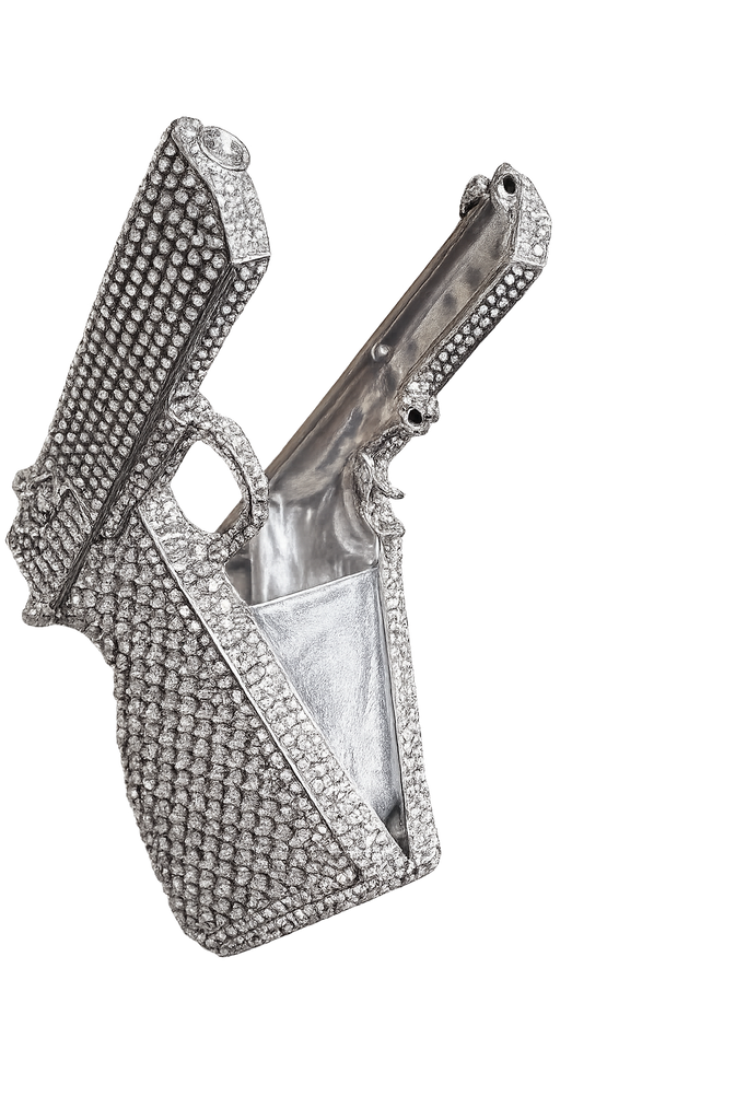 A fearless, conversation-starting statement piece designed for nights that demand attention. Sculpted in a bold pistol silhouette and encrusted in radiant crystals, the Trigger Glam Minaudière blends high-drama fashion with unapologetic edge. Equal parts art and attitude, this piece transforms rebellion into luxury — because confidence is your most powerful accessory.