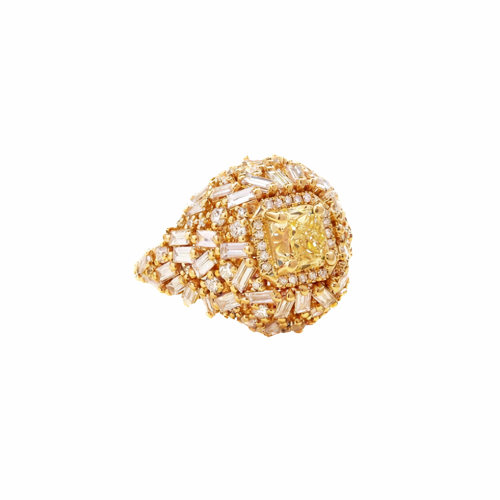1.5 carat radiant cut yellow diamond and 2.3 carat of round-brilliant and baguette diamonds set in 14k yellow gold