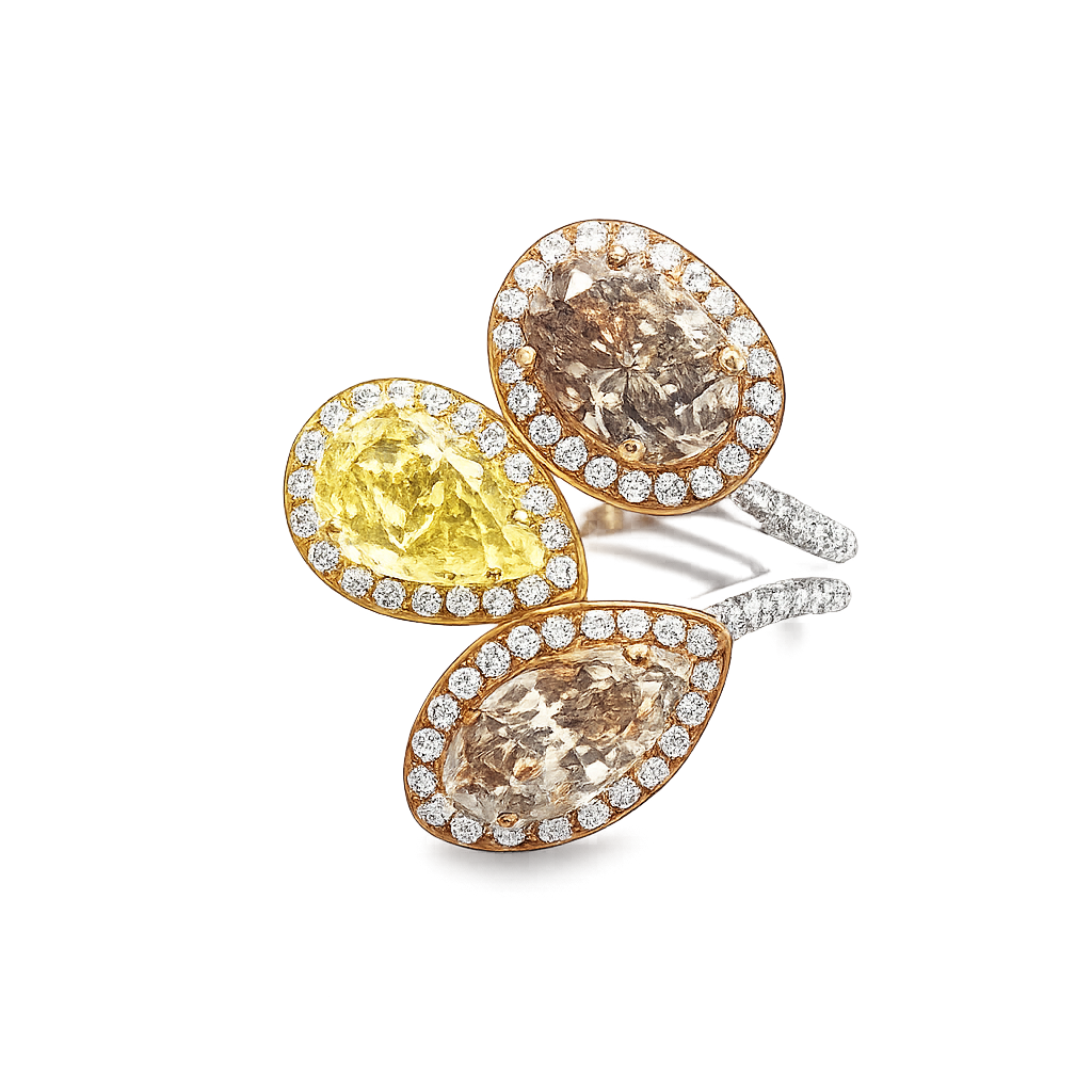 2 carat Fancy Yellow pear-shaped diamond, 2 carat marquise-cut champagne diamond, 2 carat oval-shaped champagne diamond with 0.47 carat diamond halo and pavé band