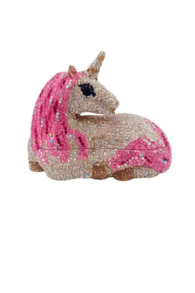 A magical statement piece made to steal the spotlight. The Pink Stardust Unicorn  Minaudière is fully encrusted with shimmering crystals in dreamy blush tones, with a bold pink mane and sparkling horn details that glow from every angle. Equal parts collectible and couture, it’s the ultimate conversation-starting clutch for nights out, events, and photos that need a little extra magic.