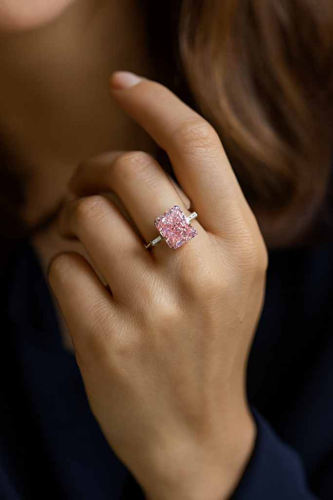 Introducing our exquisite 8-carat Vivid Pink Radiant Cut Ring, a true embodiment of sophistication and luxury. This remarkable masterpiece showcases the mesmerizing beauty of simulated pink diamond, expertly cut and crafted to perfection.