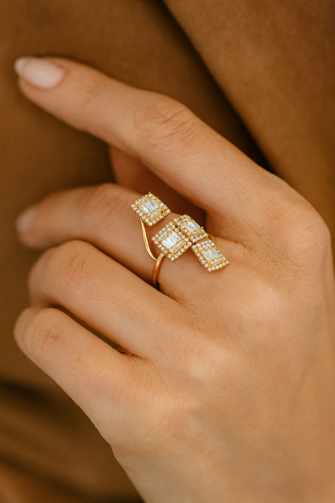Fabulous craftsmanship and marvellous setting, give this ring a highly captivating look that cannot be missed. The ring features 4 set of baguette simulated diamonds formed to create an enchanting piece.
