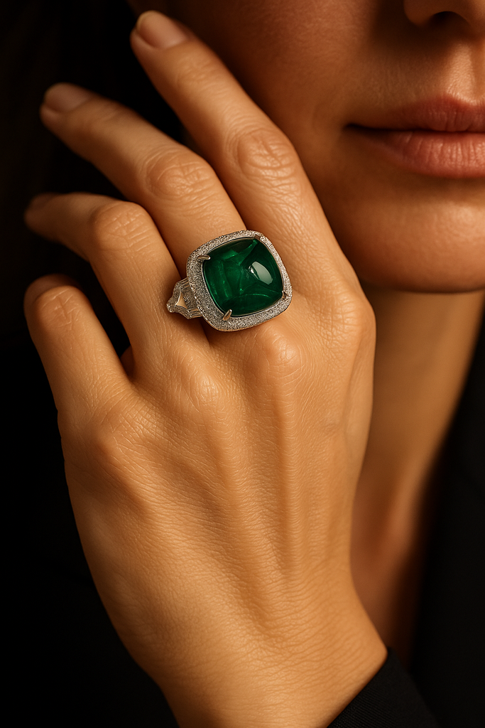 18 carat cabochon Zambian emerald with 2.22 carat of diamonds