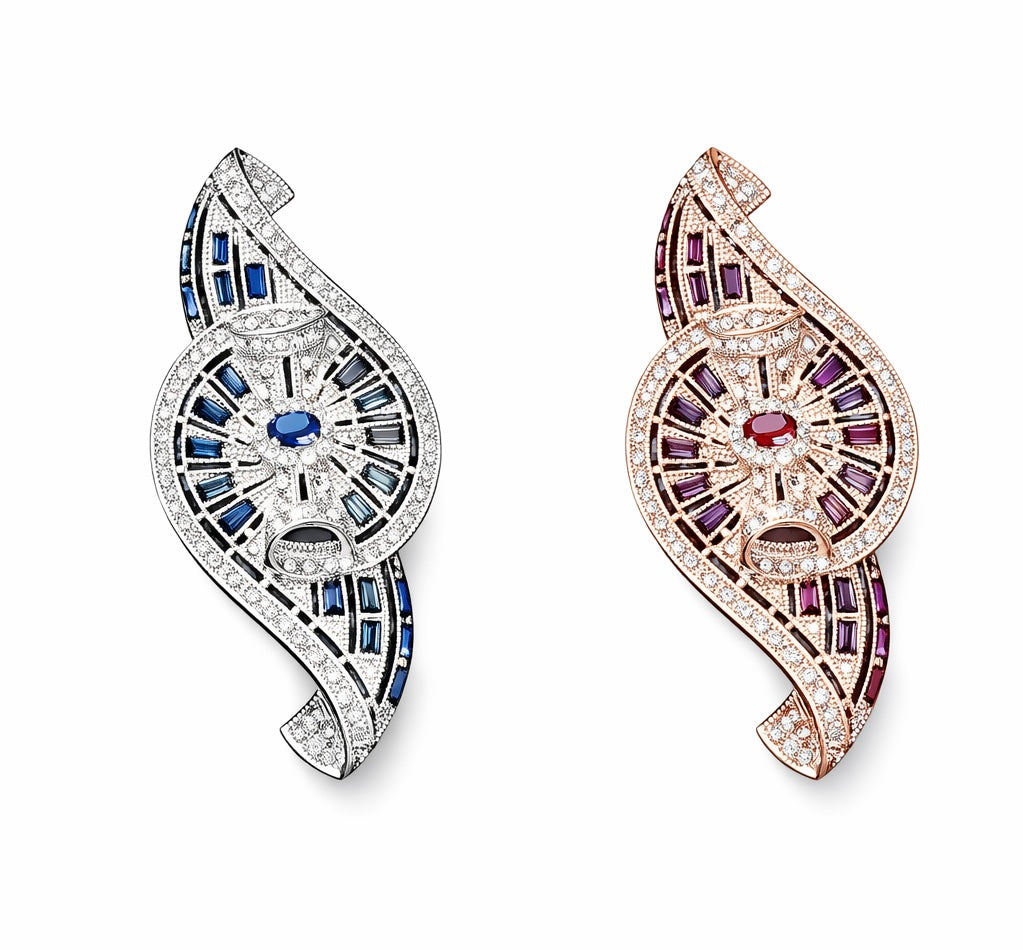 Available in luminous white tones with deep sapphire accents or warm rose tones enriched with vibrant ruby hues, the Celestia Orbit Brooch embodies both power and elegance. Its sculptural presence makes it ideal for elevating tailored blazers, evening gowns, or formal outerwear.