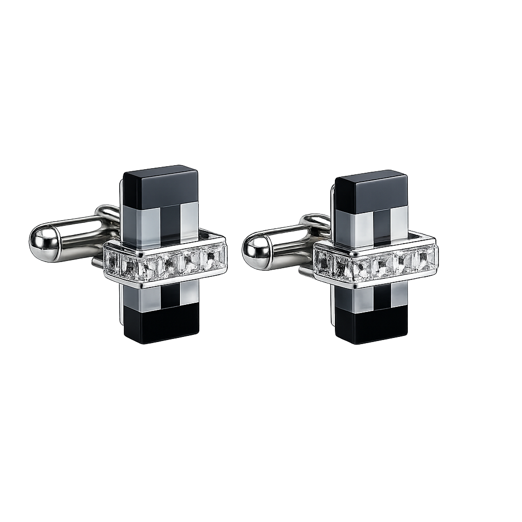 Obsidian Crossbar Cufflinks bring a sleek, architectural edge to formalwear. Built with a bold stacked silhouette in deep black and smoky gray, each cufflink is finished with a brilliant crystal crossbar that cuts cleanly across the center—adding sharp contrast and light-catching sparkle without losing its modern minimalism. The polished metal setting keeps the look refined and high-end.