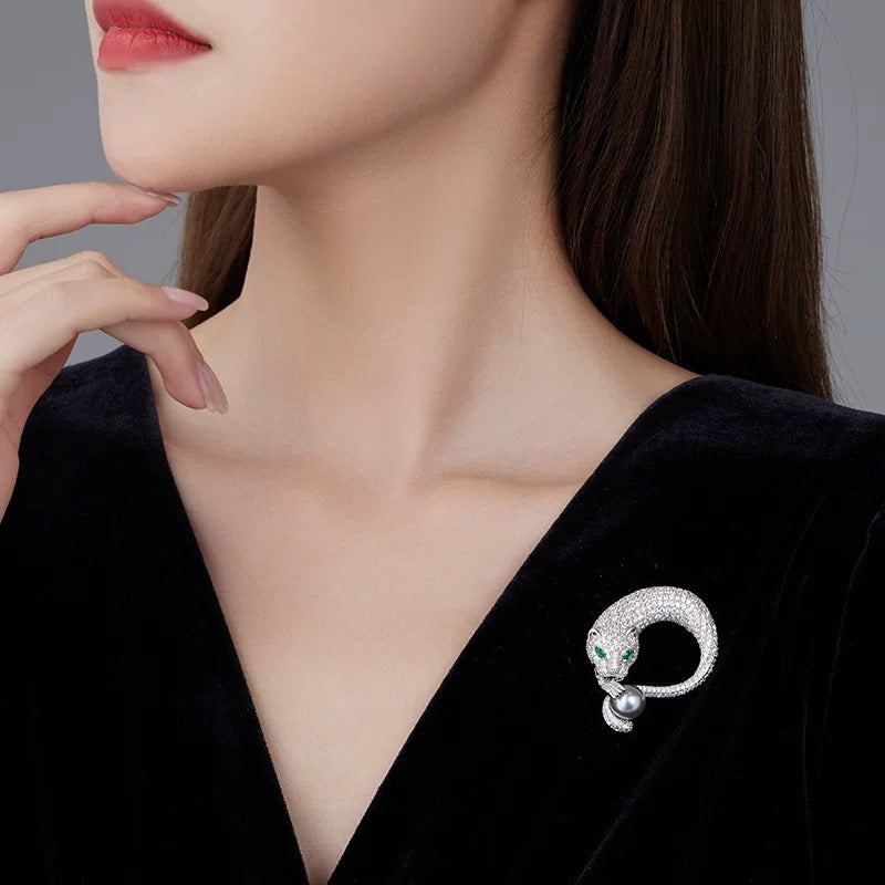 Vivid simulated emerald eyes pierce with intensity and intelligence, bringing life and spirit to the piece. In a gesture of poised power, the panther gently yet firmly clasps a luminous pearl — a radiant sphere symbolizing wisdom, purity, and strength.