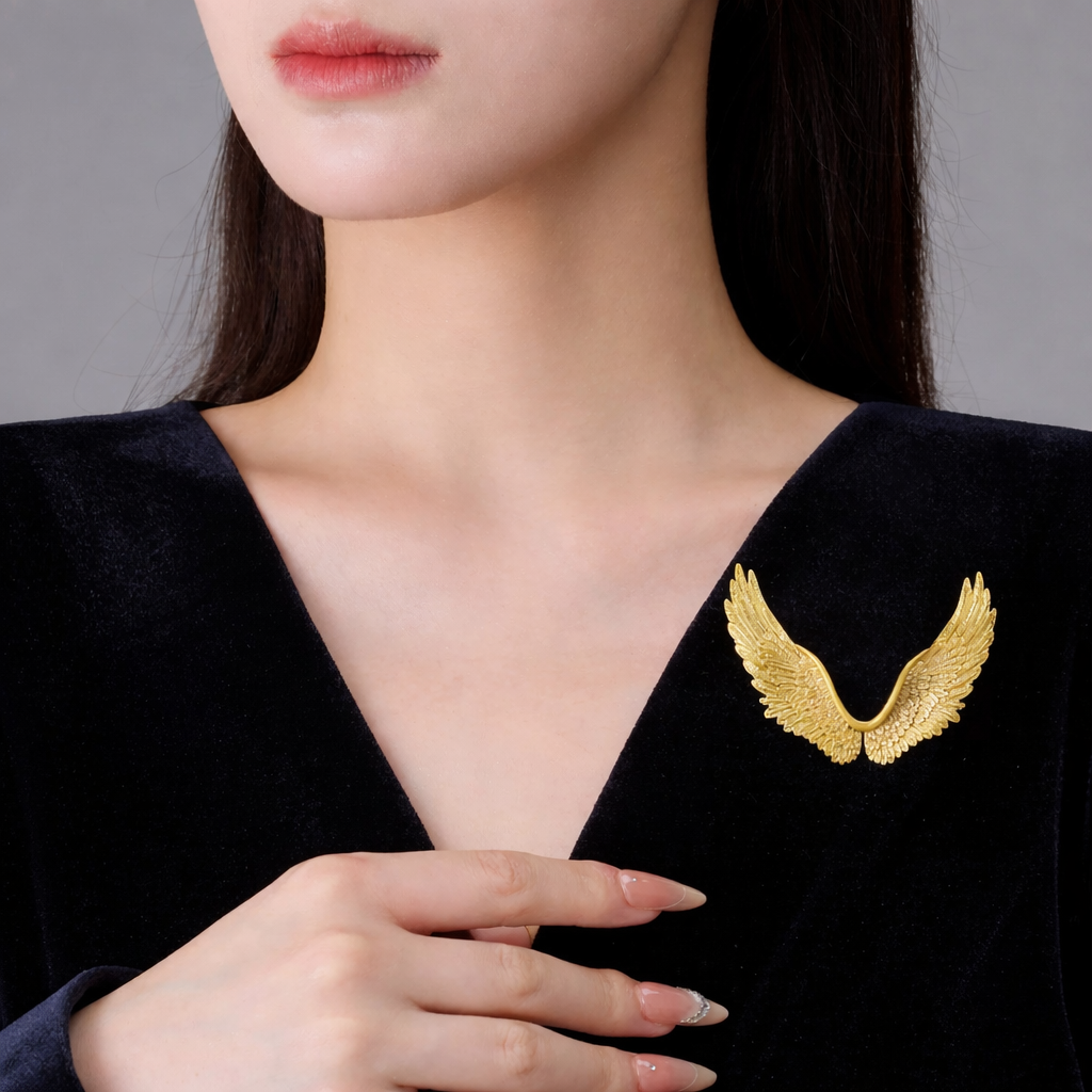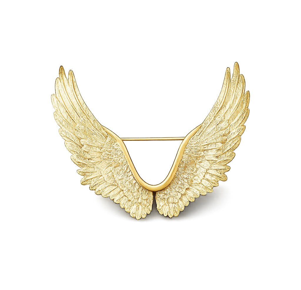 The Sovereign Wings Brooch is a statement of elevation and authority. Sculpted in radiant gold vermeil, two intricately detailed wings rise in perfect symmetry, their finely engraved feathers capturing light with every movement. The design curves gracefully at the center, forming a fluid silhouette that feels both strong and refined.